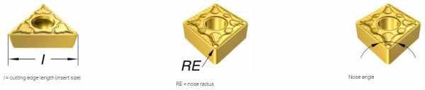 Bán kính góc dao RE, là một yếu tố quan trọng trong hoạt động tiện. Insert có sẵn trong một số kích cỡ của bán kính mũi như 0.2 – 0.4 – 0.8 .. Việc lựa chọn phụ thuộc vào độ sâu cắt D.O.C và bước tiến feed và bề mặt hoàn thiện sau gia công, khả năng bẻ phoi và độ cứng của Insert