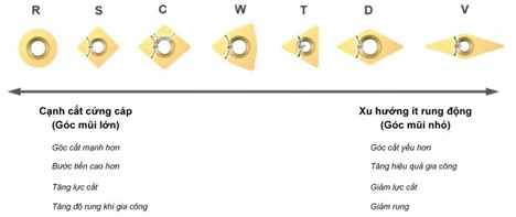 Hình dạng insert phải được chọn liên quan đến khả năng tiếp cận góc vào yêu cầu của công cụ. Góc mũi lớn nhất có thể nên được chọn để tăng độ bền và độ tin cậy. Tuy nhiên, điều này phải được cân bằng với sự thay đổi của các ứng dụng gia công cần được thực hiện, không phải lúc nào chúng ta cũng chọn Insert góc mũi lớn nhất