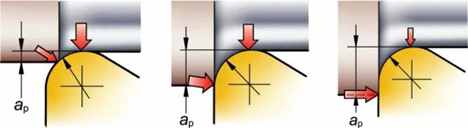 Mối quan hệ giữa bán kính mũi dao và độ sâu cắt D.O.C ảnh hưởng đến xu hướng rung khi gia công. Các lực hướng tâm đẩy insert ra khỏi bề mặt cắt và đẩy insert theo góc hướng trục hơn khi độ sâu cắt tăng.