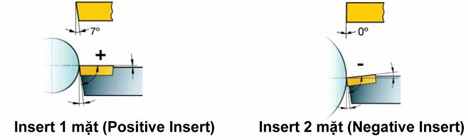Insert hai mặt (Negative Insert) có góc thoát phoi bằng 0°, trong khi Insert một mặt (Positive Insert) có góc thoát phoi nhỏ hơn 90 °. Hình minh họa của loại Positive Insert và Negative Insert cho thấy cách Insert được lắp ráp cán dao và góc nghiên khi tiếp xúc phôi.